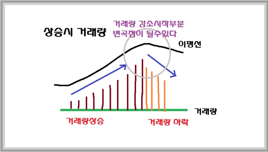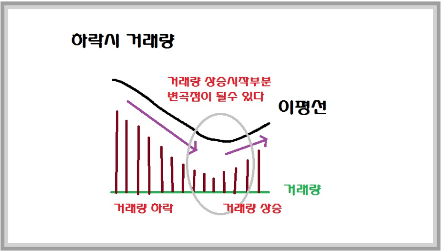 아래 그림은 상승과 하락시 거래량의 변화, 그리고 변곡점을 이해하는 데 도움을 줄 것입니다.