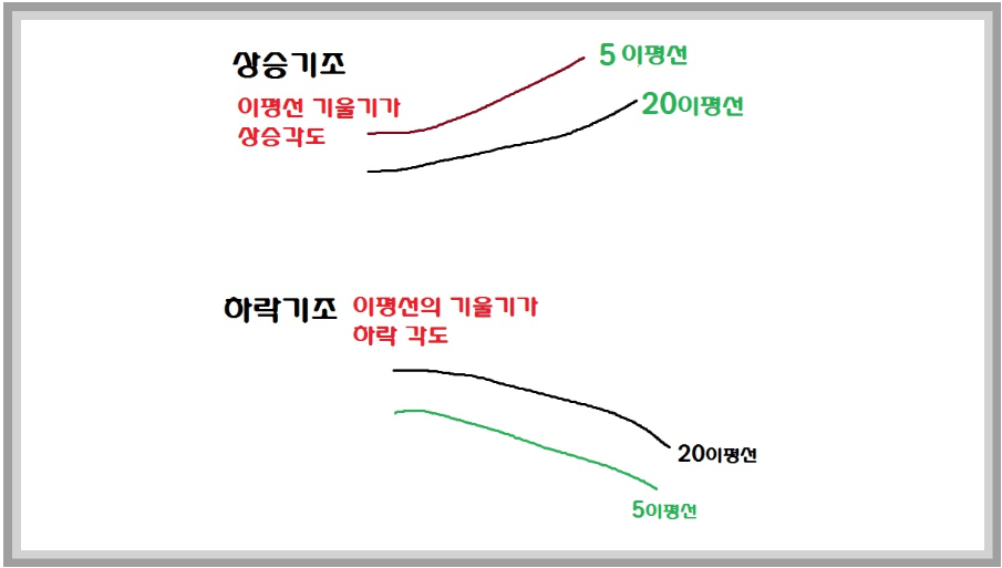 아래 그림을 보시면 이평선의 기울기가 상승/하락 추세에서 어떻게 나타나는지 더 명확하게 이해하실 수 있을 거예요.