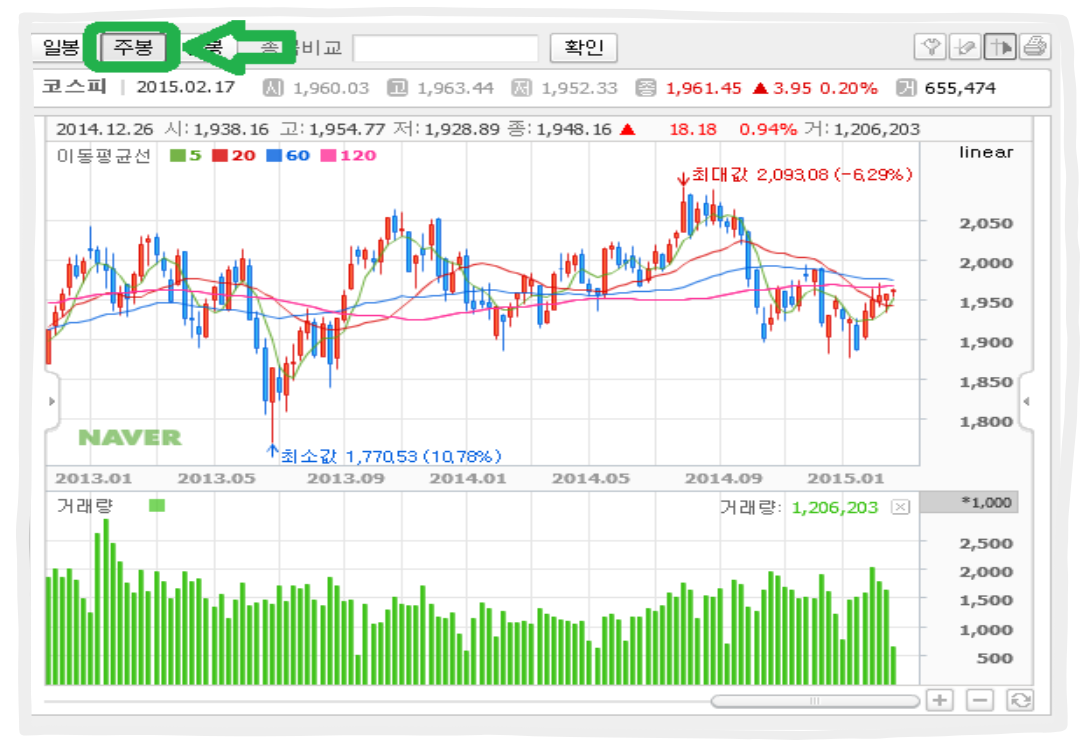 (이미지 설명: 코스피 주봉 차트로, 중기적인 시장의 흐름을 분석하는 데 활용됩니다.)