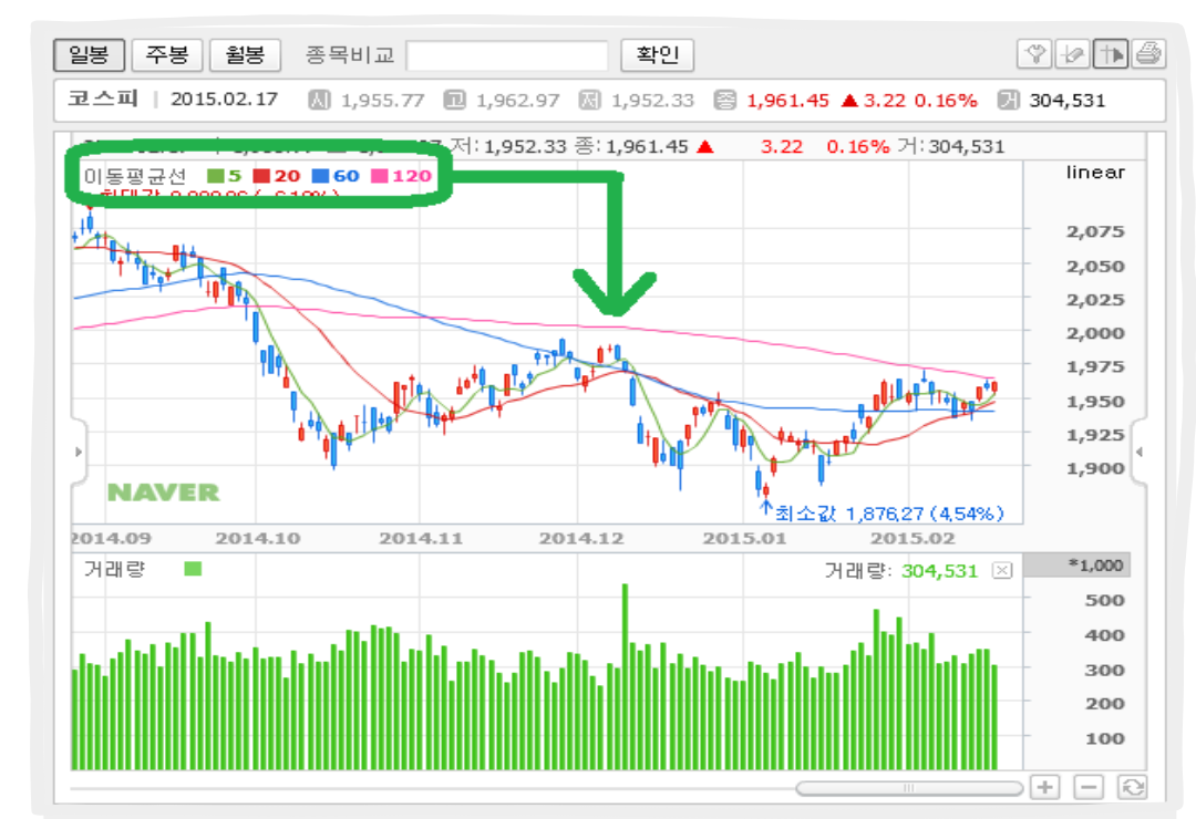 (이미지 설명: 차트 상단의 이동평균선 설정 부분을 보여주며, 5일선, 20일선, 60일선, 120일선을 나타냅니다.)