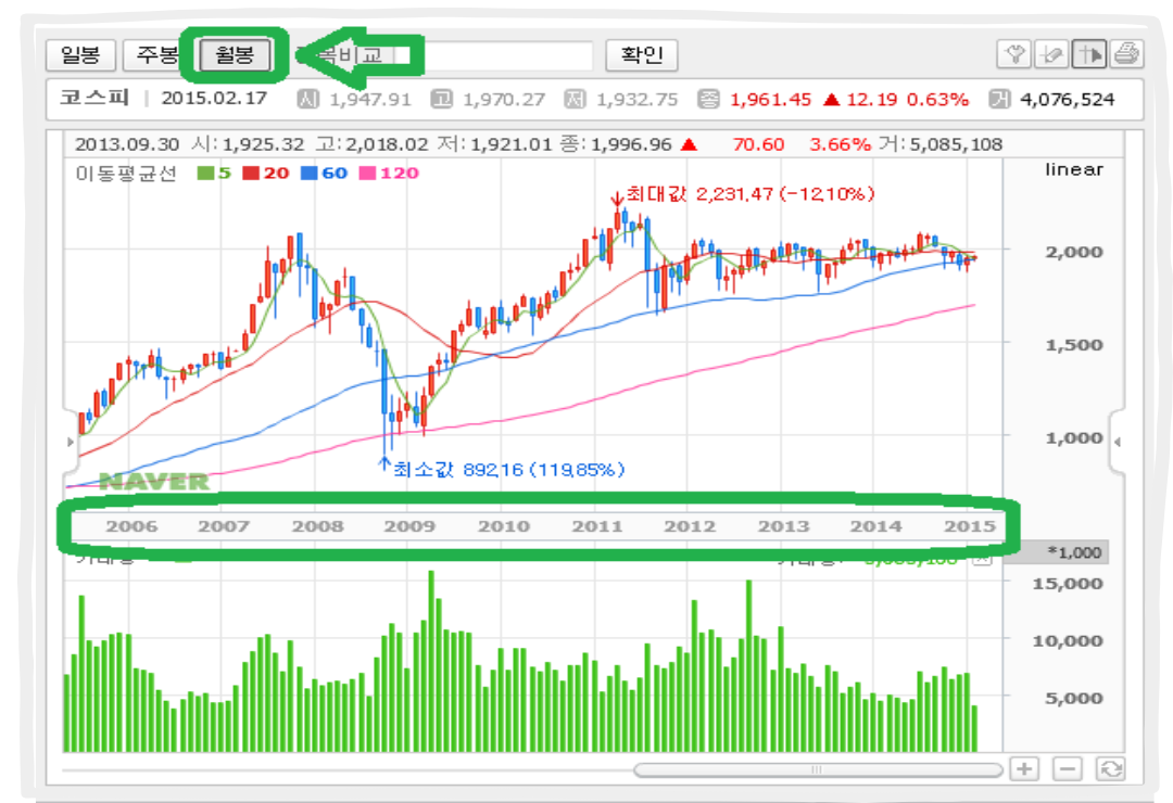 (이미지 설명: 코스피 월봉 차트로, 장기적인 대세 상승 및 하락 추세를 파악하는 데 사용됩니다.)