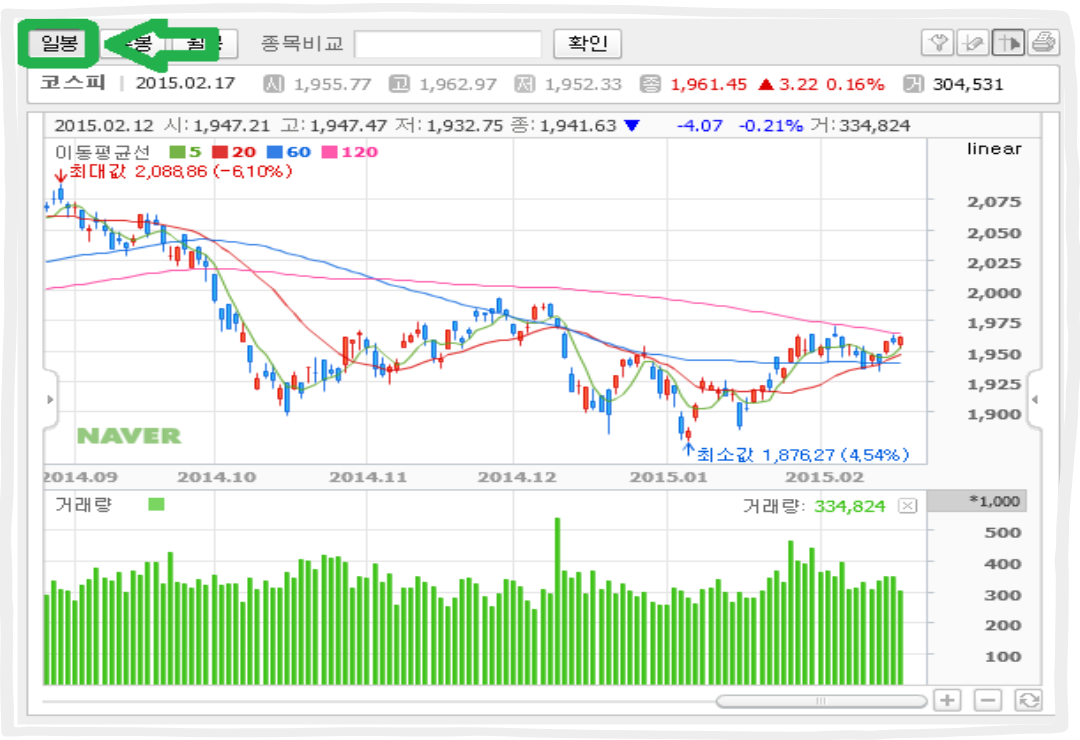 (이미지 설명: 코스피 일봉 차트로, 단기적인 주가 흐름을 파악하는 데 유용합니다.)