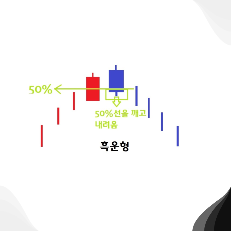 '흑운형'이라는 이름처럼, 마치 하늘에 먹구름이 끼는 것처럼 어두운 기운을 암시하는 패턴입니다. 이 패턴은 상승 추세 중에 나타나는 하락 반전 신호로 볼 수 있습니다. 전날 강하게 상승했던 양봉(파란색)의 몸통을, 다음 날 발생한 음봉(빨간색)이 50% 이상 침범하며 내려오는 형태입니다. 이는 강했던 매수세가 약해지고 매도세가 힘을 얻기 시작했다는 것을 보여줍니다. 특히 음봉의 종가가 전일 양봉의 중심선(50% 라인)을 깨고 내려온다면, 상승하려는 힘이 약해지고 하락 압력이 강해졌다고 판단할 수 있습니다. 저는 이 패턴을 볼 때마다 '아, 이제 슬슬 경계해야겠군' 하고 마음을 다잡곤 합니다. 단기 고점에서 이 흑운형이 나타난다면, 하락 전환의 신뢰도가 더욱 높아집니다.