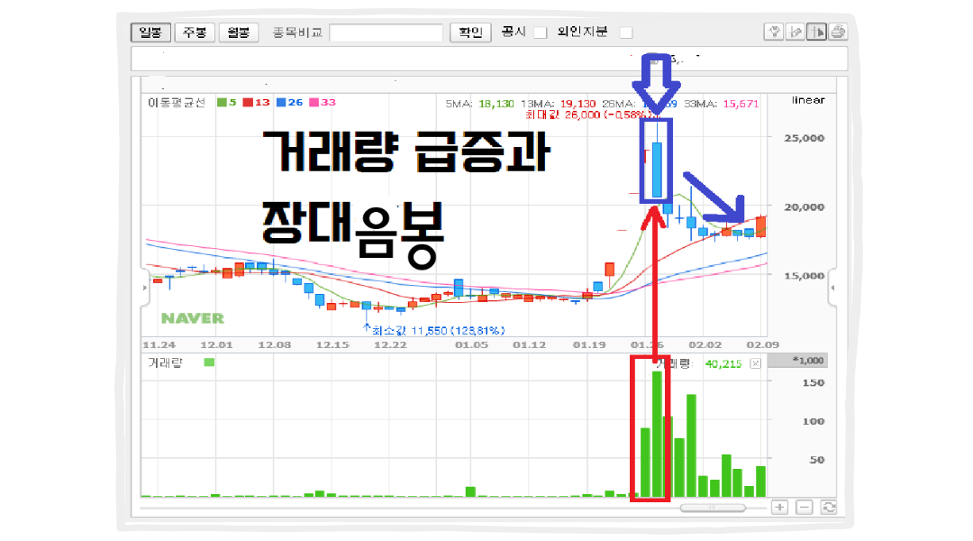 만약 어떤 재료에 의해 급등했던 종목이 더 이상 상승세를 보이지 않는다면, 빠르게 매도 대응을 준비해야 합니다. 세력들이 재료를 이용해 매집을 마쳤다면, 이들이 빠져나가는 시점은 거래량 급증과 함께 긴 음봉이 나타나는 경우입니다. 이는 세력들의 물량 털기로 보아야 하며, 즉각적인 대응이 필요합니다.