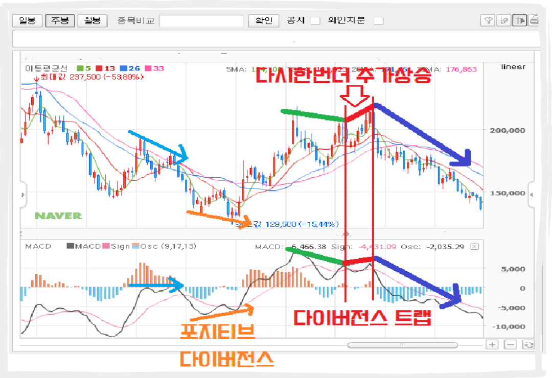 주가는 계속 고점을 높여가며 상승하고 있는데, MACD 같은 보조지표는 오히려 고점을 낮추거나 횡보하는 경우입니다. 어떠세요? 주가는 오르는데 왠지 모르게 힘이 빠지는 듯한 느낌이 들지 않나요? 이는 주가가 앞으로 약세로 전환될 가능성이 높다는 일종의 '경고등'입니다. '아, 이제 슬슬 매도를 고민해야겠는데?' 하고 진지하게 생각해 볼 타이밍인 거죠.